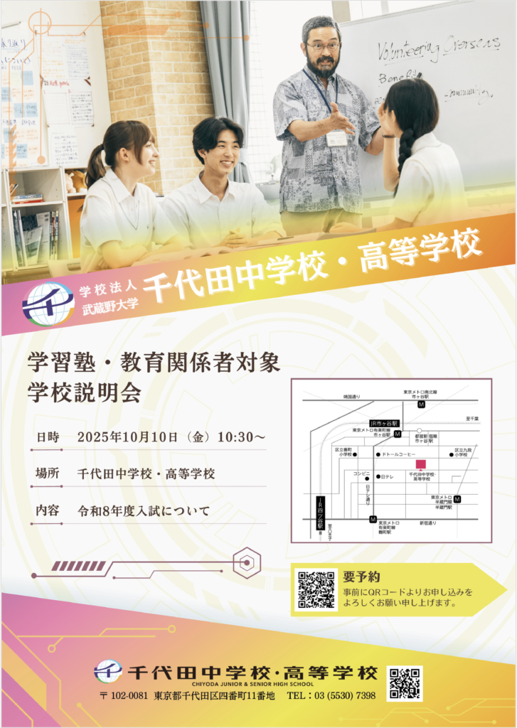 10月10日(金)、学習塾関係者・教育関係者の皆さまを対象に学校説明会を開催いたします。教育方針や学習環境、入試要項などについてご説明するとともに、本校の日々の取り組みを実際にご覧いただけます。 お申し込みは以下の方法で...
