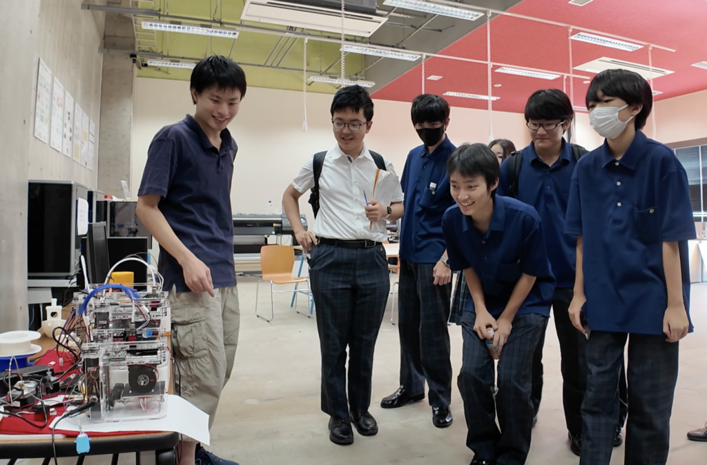 学生が自作した3Dプリンターに興味津々