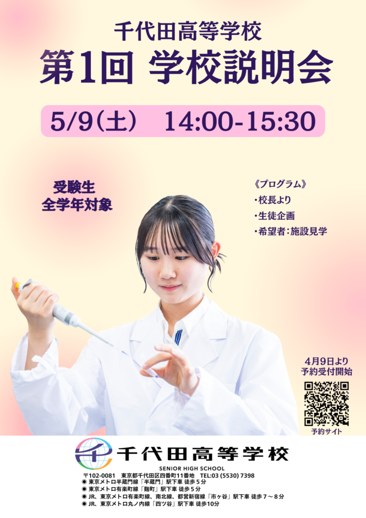 5/9(土)に学校説明会を実施いたします。 本校の教育方針や特色、生徒たちの活動の様子などをご紹介させていただく予定です。 受験生の皆様、保護者の皆様にとって、千代田高等学校をより深くご理解いただける良い機会となるかと存...