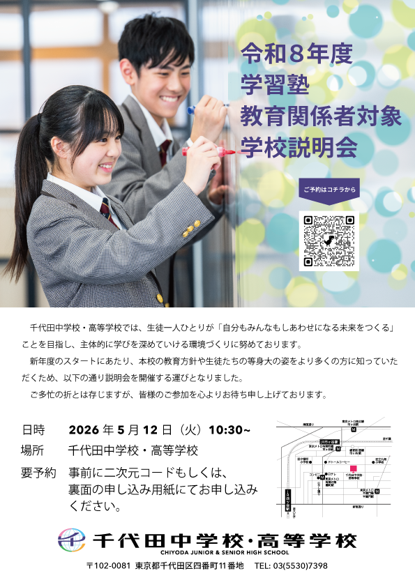 みらい子ども進学フェア2026千代田中学校・高等学校では、私たちと一緒に、自分もみんなもしあわせになる未来をつくってくれる仲間を募集しています。 4/25(土)に本校にて中学校学校説明会を開催いたしますが、それに先駆けて...
