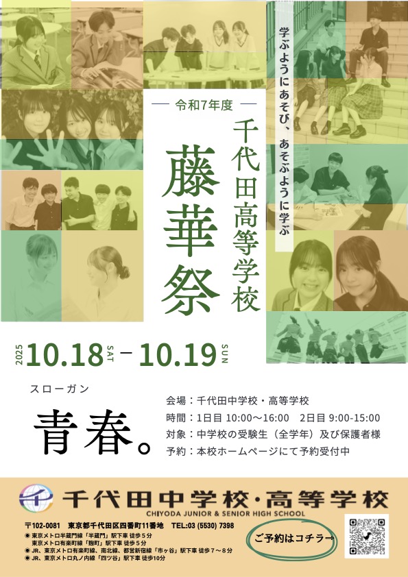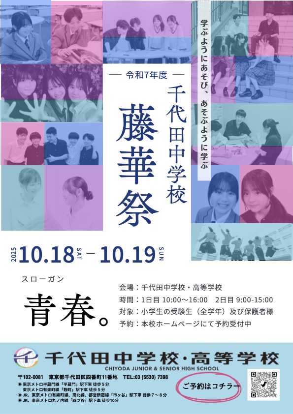 「藤華祭」の来場予約がはじまりました。千代田中学校・高等学校として記念すべき、初めての藤華祭となります。ぜひご来場ください。生徒 教職員一同、楽しみにお待ちしております。