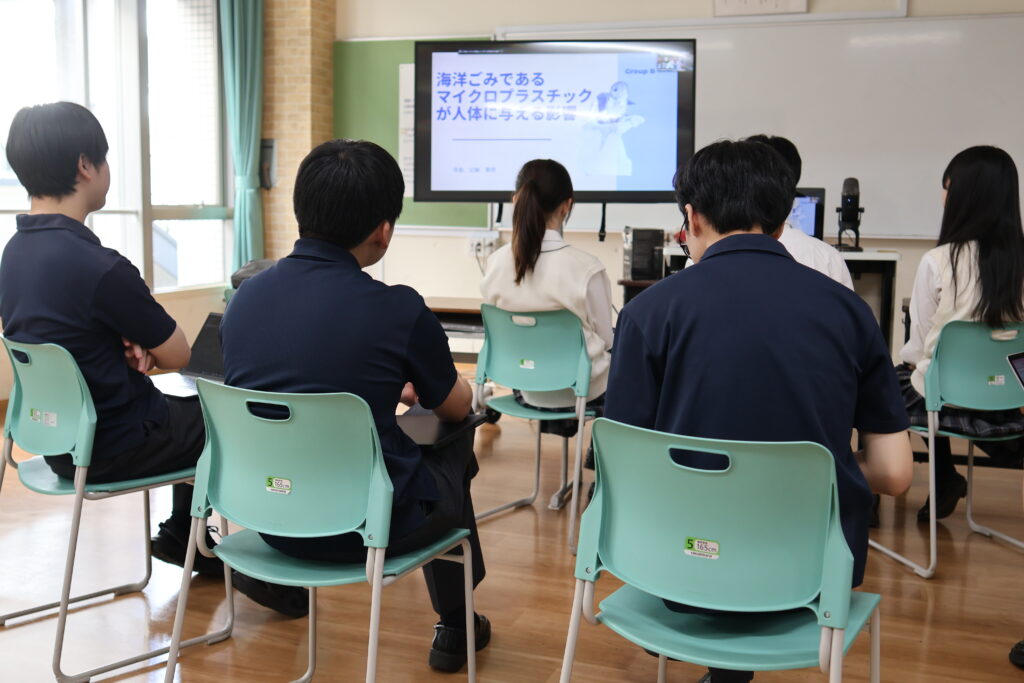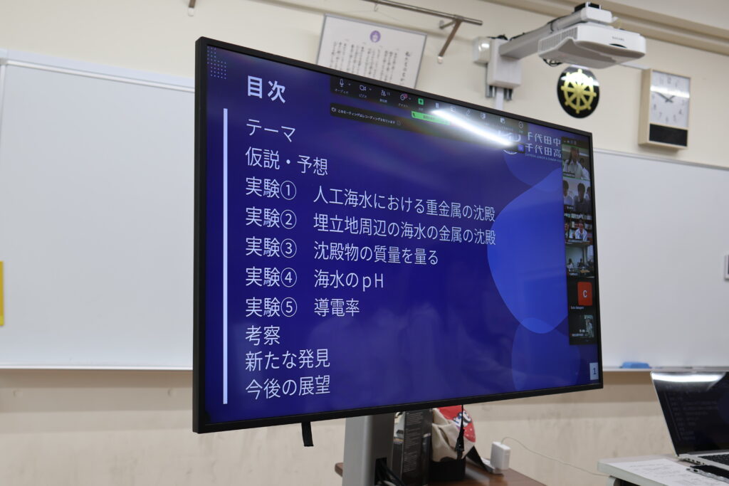 本校の2年生3人が選んだテーマは、「埋立地周辺の水質調査」埋立地周辺数カ所の海水を取水し、沈殿物の中の重金属等を計測。場所ごとに得られた数値の違いを、埋め立て地の成り立ち、周辺の環境や条件から考察するというもの。テンポよくまとめられた発表は分かりやすく他校生からの質問で、考察はさらに深まりました。