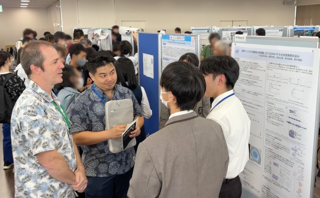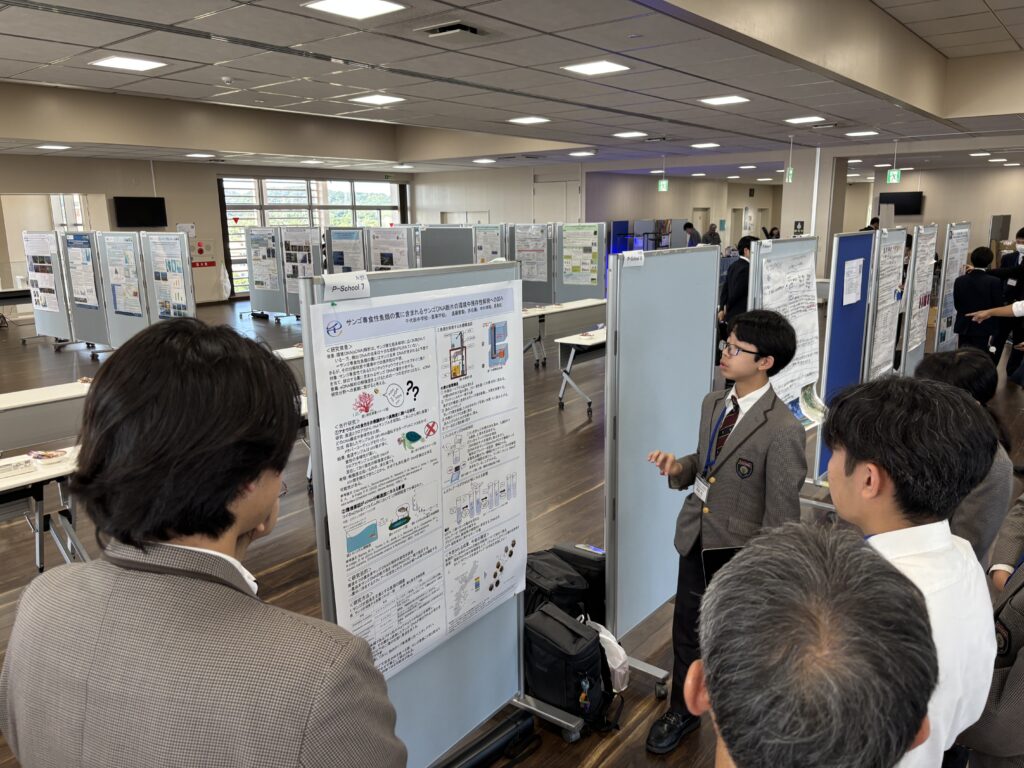 小学生から高校生までのポスター発表部門で、生徒たちは「サンゴ専食性魚類の糞に含まれるサンゴDNA断片の環境中残存性解明への試み」、「造礁サンゴの生殖細胞と体組織におけるDNAメチル化状態解明の試み」の2テーマで展示・発表を行いました。