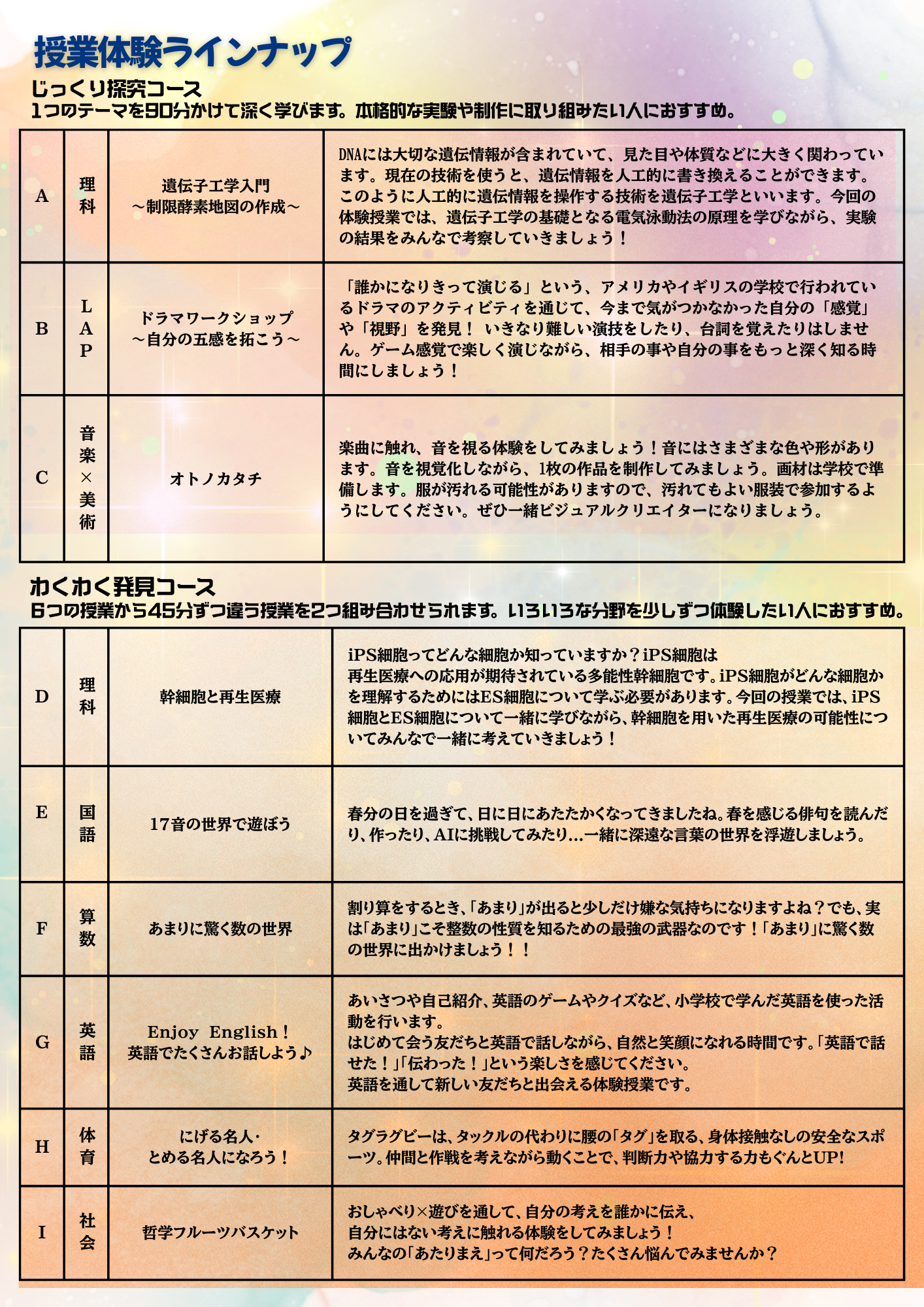 A〜Cの授業は、90分完結のため1つお選びいただけます。
