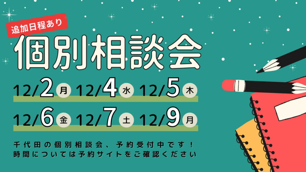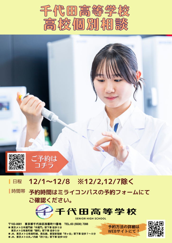 受験生の皆様、保護者の皆様 日増しに寒さが厳しくなり、受験本番への意識が高まる季節となりました。 千代田高等学校では、以下の日程で「個別相談会」を実施いたします。 この時期ならではの受験に関する具体的なご質問や、入学後の...